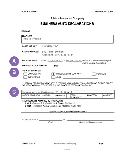 It is a good idea to review the information for accuracy and to keep a copy of your declarations page for your records. Sample car insurance declaration page. Click here to zoom in.